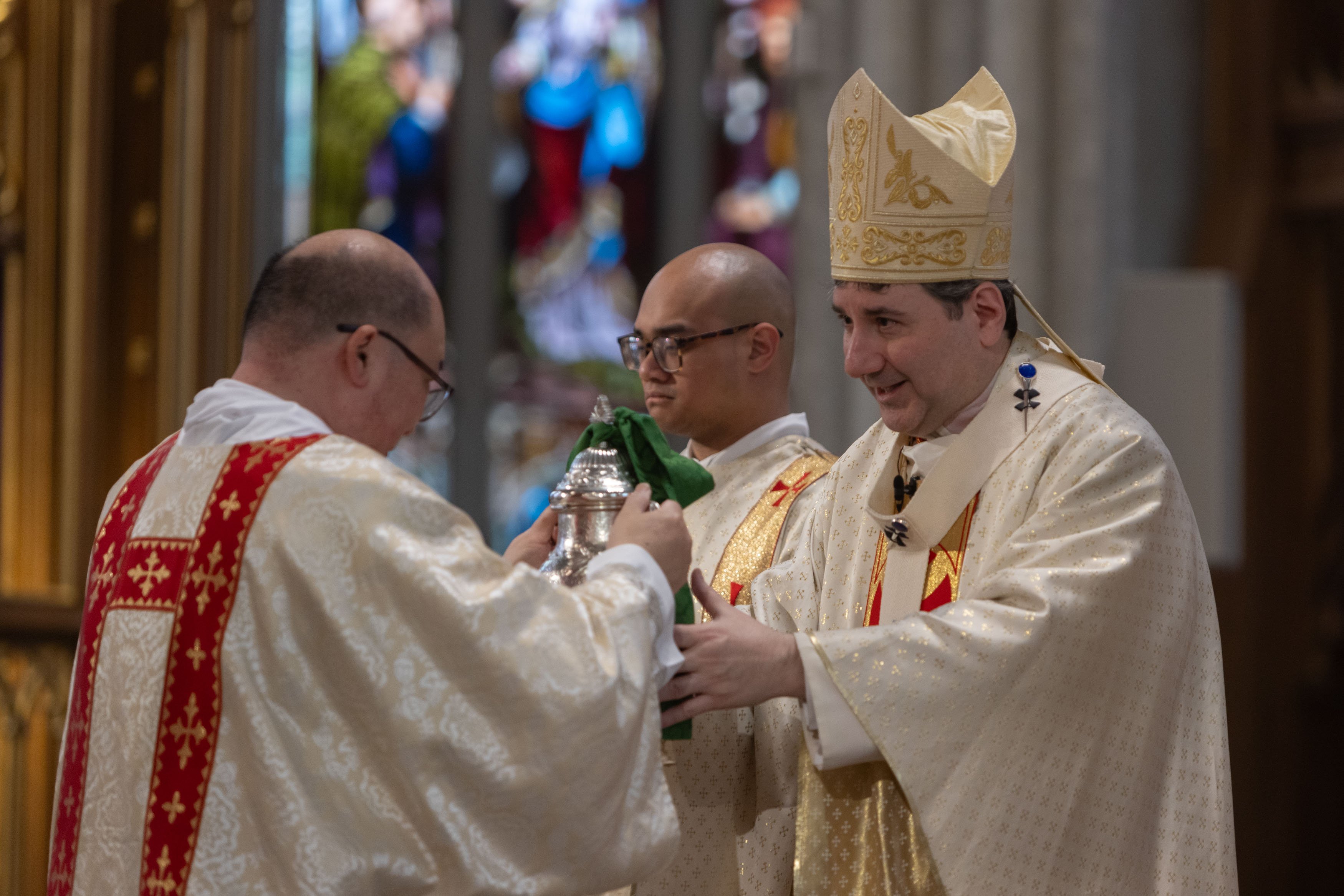 The Chrism Mass also provides an opportunity for priests of the archdiocese to renew their priestly promises and gather in solidarity with their bishop. At this year’s celebration, there were upwards of 350 priests in attendance – alongside 37 permanent deacons and 31 seminarians. Of special note, this year’s Mass recognized 26 Jubilarian priests celebrating 25, 50, 60 and 75 years since their ordination to the priesthood.